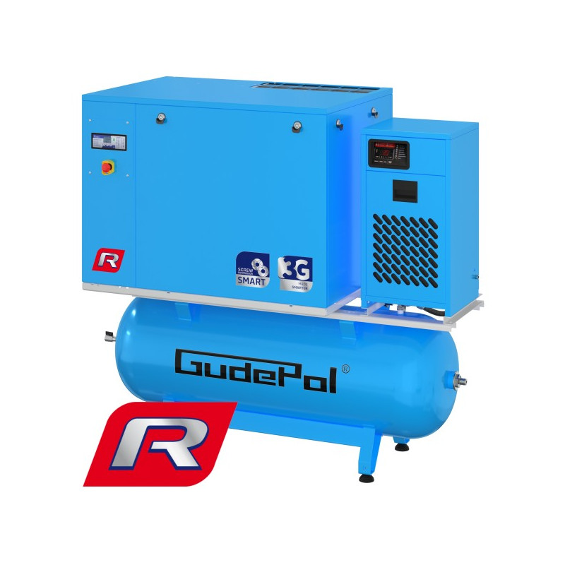 Kompresor śrubowy Gudepol SMART-R-3G VT to nowoczesne i energooszczędne rozwiązanie dla firm, które potrzebują stabilnego źródła sprężonego powietrza. Urządzenie łączy wysoką efektywność pracy z kompaktową budową i rozbudowanym systemem przygotowania powietrza.
